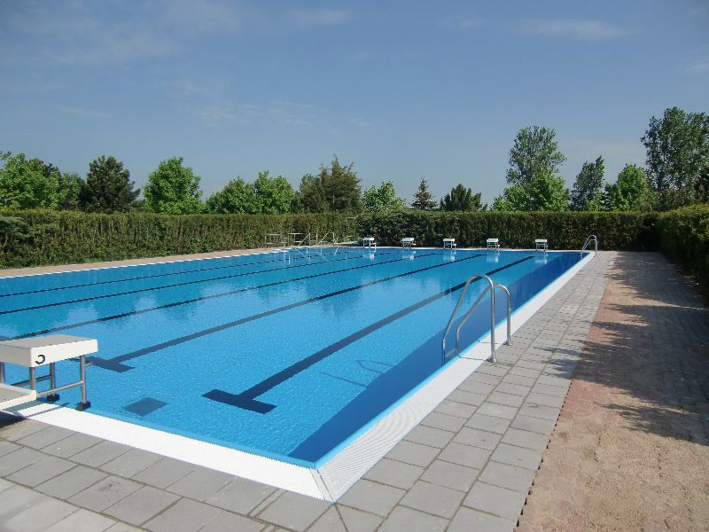 Schwimmbadfolien dürfen für die Folienauskleidung nur verwendet werden, wenn sie den Güterrichtlinien des Verbandes der Deutschen Bodenbelags-Kunststoff-Folien- und Beschichtungsindustrie e.V. oder kurz VBK für Schwimmbeckenauskleidung entsprechen. Die Folie für die Folienauskleidung für öffentliche Bäder sollte mindestens 1,5 mm stark sein. Ferner muss in der Folie eine Gewebeeinlage eingearbeitet sein. Schwimmbadfolien sind in verschiedenen Farben erhältlich. So ist es möglich die Folienfarbe, der Farbe der Überlaufrinne und den Beckenwänden anzupassen. Um Unebenheiten ausgleichen zu können, verwenden wir hochwertiges Polyestervlies. Dieses wird ebenso wie die Verbundbleche, die zur Befestigung der Randabschlüsse dienen, nach den Herstellerverarbeitungsrichtlinien verarbeitet. Für die Auskleidung von Treppen, Stehstufen, Überlaufrinnen usw. verwenden wir gewebeverstärkte Schwimmbadfolie. Um höchsten Ansprüchen genügen zu können und auch aus Gewährleistungsgründen, wird bei der Folienauskleidung antibakterielles Vlies und Bodenvlies aus Polyester mit einer Dichte von etwa 300 g/ m² verwendet. Schwimmbadfolie wird entweder durch Quell- oder Heißluftverschweißung verarbeitet. Die Ein- bzw. Abdichtung von Einbauteilen, die über Press- oder Schraubflansche verfügen, sollte ausschließlich durch einen Folienverarbeiter angelegt werden. Im Bereich der Dichtflansche ist es besonders wichtig, die Folie fachgerecht zu verlegen. In diesem Bereich darf nicht auf Stoß gearbeitet werden. Außerdem dürfen dort keine PVC-Weich-Bahnen, die über eine profilierte Oberfläche verfügen, verlegt werden. Bei der Folienauskleidung zur Abdichtung der Dichtflansche ist darauf zu achten, dass bei der Flächenpressung die Fließgrenze der Schwimmbadfolie berücksichtigt wird. Bei der Auswahl von Beckeneinbauteilen und Dichtungsmaterialien muss ferner auf die chemische und physikalische Verträglichkeit der Folienauskleidung geachtet werden. PVC-Folien sind bei der Folienauskleidung bis einer Neigung von 30 Grad zwar wasserdicht, aber nicht diffusionsdicht. Aus diesem Grund ist eine wasserdichte Unterkonstruktion sowie ein Kondensatablauf hinter der Folienauskleidung im Schwimmbecken zu installieren. Chlor- und Rostrückstände, die, bevor die Folienauskleidung angelegt wird, nicht entfernt wurden, hinterlassen auf der Folienauskleidung Spuren. Wird die Folienauskleidung von den so genannten Chlorfestteilchen angegriffen, verfärbt sich die Folie an diesen Stellen Weiß. Alle Weichgummiprodukte, die über einen längeren Zeitraum mit PVC-Folie in direktem Kontakt sind, führen ebenfalls zu Verfärbungen auf der Schwimmbadfolie. Öle, Fette und eine erhöhte UV-Strahlung sind Gift für die Folienauskleidung. Sie muss fachgerecht gereinigt und gepflegt werden, um eine möglichst lange Lebensdauer garantieren zu können. Bevor die PVC-Folie verlegt wird, sollte laut der bsw-Richtlinie eine Dichtigkeitsprüfung des Rohrsystems durchgeführt werden. Die Überlappungsbreite sollte bei der Folienauskleidung mindestens 50 mm betragen. Um Quellverschweißungen anlegen zu können, werden die Flächen auf der PVC-Folie beidseitig mit Hilfe von Tetrahydrofuran (THF) gelöst. Die Mindestbreite der Fläche beträgt dabei 30 mm. Für Heißluftnähte sollte die Überlappung mindestens 20 mm betragen. Durch verschiedene Detaillösungen kann sich die Überlappungsbreite jedoch verringern. Nach der fachgerechten Verschweißung der PVC-Folie sind alle Nahtkanten zu überprüfen und zu versiegeln. Für diesen Zweck wird eine Nahtversiegelung in Form einer PVC-Lösung eingesetzt, die mit einer entsprechenden Ablüftung fachgerecht zu versiegeln ist. Nachdem die Folienauskleidung im Schwimmbecken verschweißt wurde, kann die Erstbefüllung des Schwimmbeckens erfolgen. Um eventuelle Falten in der Folie glätten zu können, sollte die Befüllung sehr langsam erfolgen. Zunächst sollte das Wasser nur bis zu einer Höhe von etwa 10 bis 20 cm einlaufen. Falten bilden sich für gewöhnlich nur in sehr großen Schwimmbecken und meistens auch nur dann, wenn das Schwimmbecken, nachdem die neue Folienauskleidung angelegt wurde, über einen längeren Zeitraum nicht mit Wasser befüllt wurde. Wir empfehlen aus diesem Grund, gleich nachdem die Folienauskleidung angelegt wurde, das Schwimmbecken mit etwa 15 cm Wasser zu befüllen. Durch diese geringe Wasserhöhe wird die Folienauskleidung geschützt, während alle anderen Arbeiten am Schwimmbecken weiter geführt werden können. Schwimmbecken mit Folienauskleidung bleiben im Winter meistens mit Wasser befüllt. Eventuelle Eisdruckkräfte lassen sich mit Hilfe von Eisdruckpolstern ausgleichen.