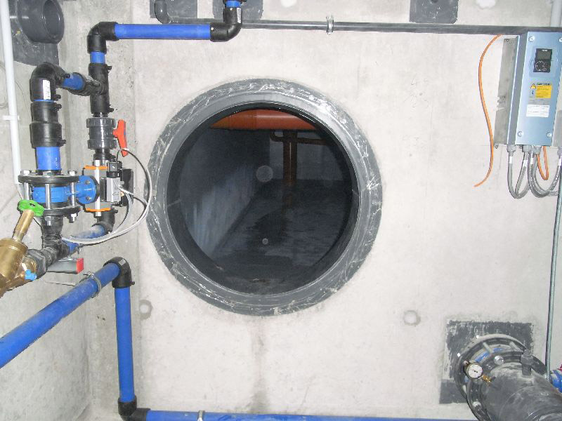 Eine Folienauskleidung bringt jedoch noch viele weitere Vorteile mit sich. Die Folie weist von beiden Seiten her eine absolut 100-prozentige Dichtigkeit auf. Das heißt, es kann kein Wasser vom Trinkwasserbehälter nach außen treten. Andersherum kann aber auch kein Fremdwasser von außen nach innen in den Trinkwasserbehälter dringen und das Trinkwasser dadurch verschmutzen. Die Folienauskleidung zeichnet sich unter anderem durch ihre hohe Lebensdauer aus. Diese kann allerdings nur dann gewährleistet werden, wenn die Kunststoffdichtbahnen, die für die Folienauskleidung verwendet werden, fachgerecht verlegt und miteinander verschweißt wurden. Es ist darauf zu achten, dass die Folienbahnen auf einer Drainagefolie aufliegen. Dadurch wird verhindert, dass Unebenheiten in der Folienauskleidung auftreten. Sollte der Boden stark uneben sein, empfehlen wir die Drainagefolie doppelt zu legen oder unter Umständen sogar mehrfach doppelt zu verlegen. Die Drainagefolie dient zur Entwässerung (Drainage). Gleichzeitig verhindert sie, dass keine unzulässigen Druckentwicklungen entstehen, wenn der Wasserspiegel abweicht. Die Folie kann nur eine hohe Haltbarkeit aufweisen, wenn eine gut funktionierende Drainage hinter der Folie installiert wurde. Beim Verlegen der Folie muss darauf geachtet werden, dass sie mit einem ausreichenden Gefälle verlegt wird. Zum Rohrkeller des Trinkwasserbehälters muss im Anschluss am tiefsten Punkt ein Kontrollrohr verlegt werden. Mit diesem lässt sich überprüfen, ob Leckagen, also Undichtigkeiten vorliegen. Sollte nicht klar zu erkennen sein, ob auftretendes Leckagewasser von außen auf den Trinkwasserbehälter drückt oder ob das Problem direkt auf die Wasserkammer zurückzuführen ist, gibt ein Nachweis über Restchlor in der Regel Aufschluss. In einigen Fällen wurde das Restchlor im Innenbereich durch eine Betonpassage neutralisiert. So ist es praktisch unmöglich Chlor im Leckagewasser ausfindig zu machen. In diesem Fall kann ein Färbeversuch mit einer Farbe, die nicht wasserschädlich ist, durchgeführt werden und so zu einem Ergebnis führen.